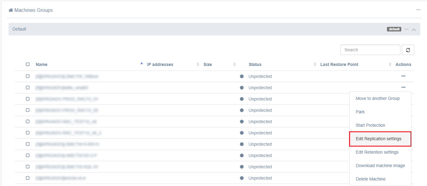 Task Stop replicating a machine Solution Park the machine to stop its replication. On the Customer page in the “Machines Groups” section click on the “…” button next to the corresponding machine, select “Park”.